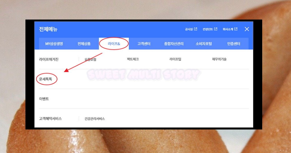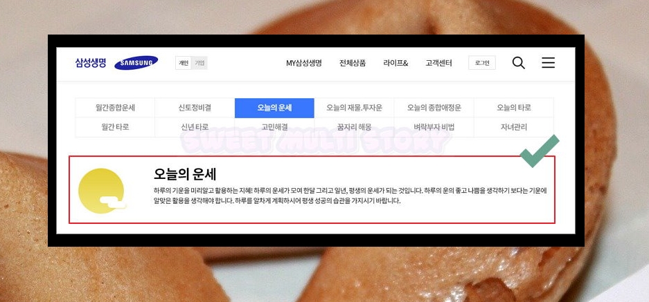 1. 요즘에는 집에서 보기 편한 운세 서비스가 많이 생겼어요. 무료로 이용할 수 있는 역술 전문 사이트도 있고, 우리가 이번에 이용할 사이트처럼 방문자들에게 서비스로 제공하는 곳도 있어요. 삼성생명 공식 사이트의 경우 후자에 속하는데요. 퀄리티 높은 풀이를 보기에 안성맞춤이에요.