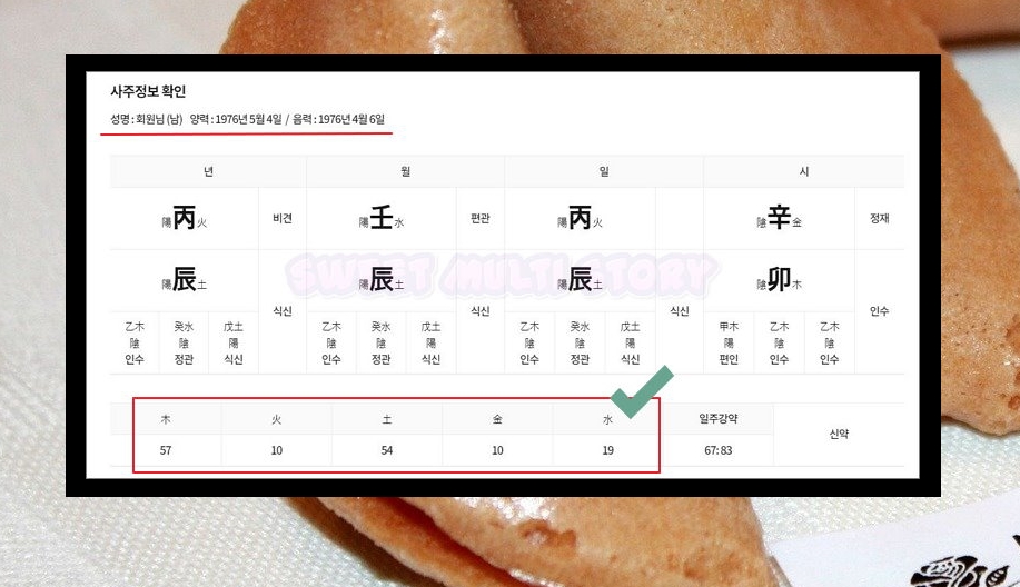 6. [운세보기] 버튼을 클릭하면 결과를 확인할 수 있는데요. 가장 먼저 만나보는 것은 사주정보에요. 양력으로 입력했다면 음력으로 계산한 생년월일을 알 수 있어요. 반대의 경우 양력으로 계산된 결과를 확인할 수 있겠죠.