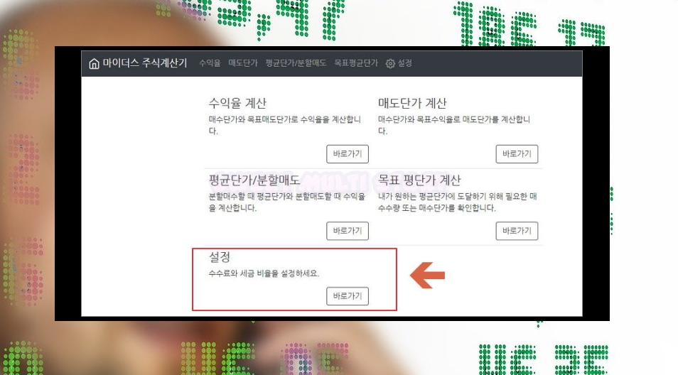 2. 이곳에서 제공하는 계산기 프로그램은 다양해요. 수익율, 매도단가, 목표 평단가, 평균단가, 분할매도에 관련된 계산을 할 수 있는데요. 해당 프로그램을 이용하기 전에 해야 할 일이 있어요. 수수료와 세금 비율을 설정하는 일이에요. 증권사마다 주식 매매를 할 때 발생하는 수수료가 달라요. 세금의 경우에는 etf의 경우 일반 종목에 비해 저렴하고요.