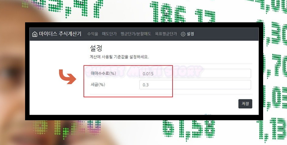 3. 그럼 본인이 이용하고 있는 증권사의 매매 수수료와 거래 시 납부해야 하는 세금을 입력해 주세요. 계산에 사용될 기준값을 설정했다면 저장 버튼을 클릭하면 돼요. 이 상태에서 주식 평단가 계산기를 이용하면 되는데요.