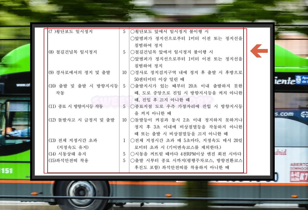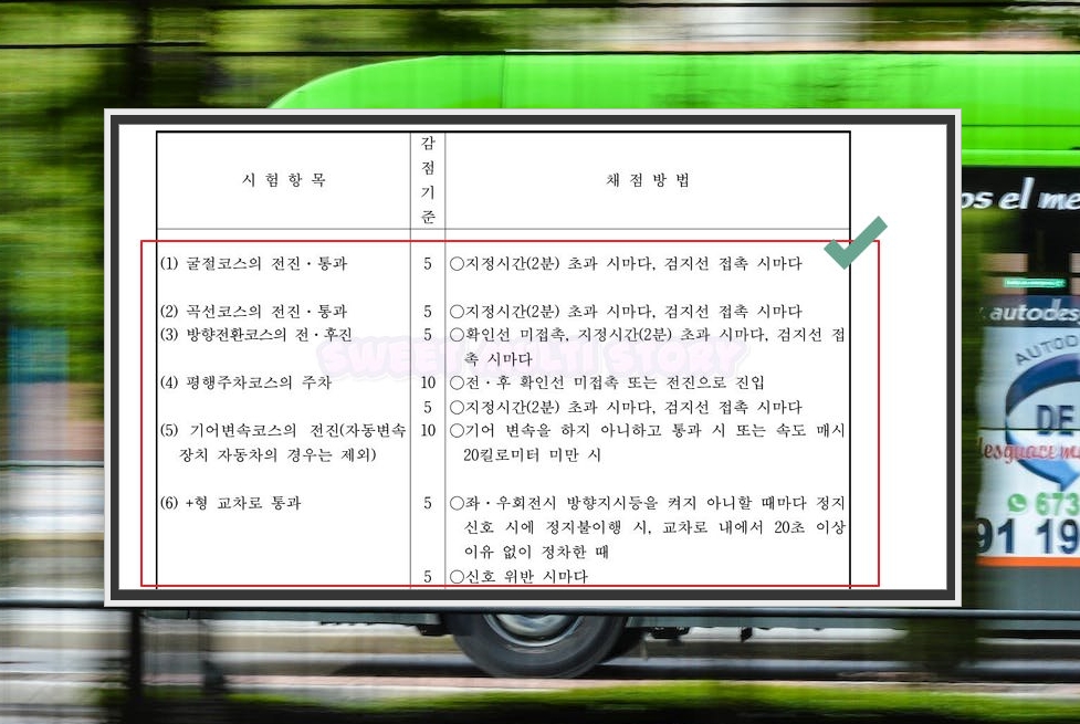 5. 1종대형면허 시험을 보기 전에 채점 방법을 숙지해 놓는 것이 좋아요. 항목에 따라 감점 기준과 채점 방법이 다른데요. 이러한 내용을 잘 기억해 놓으면 중요한 부분에 집중할 수 있어요.