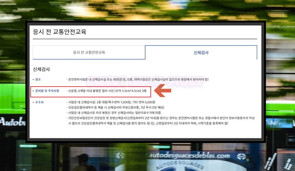 3. 시험 응시 전에 신체검사를 받아야 해요. 검사를 받는 방법은 간단해요. 신분증과 6개월 이내에 촬영한 컬러 사진 2매, 수수료를 준비하고요. 그 다음 시험장 내 신체검사실이나 병원을 방문하면 돼요. 1종 보통, 7년 무사고인 경우에는 건강검진결과내역서 등을 제출하면 신체검사를 무료로 받을 수 있어요.