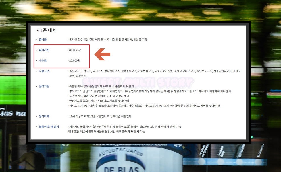 4. 본격적으로 1종대형면허 취득방법을 알려드릴게요. 일단 시험 접수를 해야 해요. 현장 예약이 가능하지만, 집에서 온라인으로 접수하는 것이 편해요. 응시 수수료는 2만원이고, 80점 이상을 맞아야 합격이에요.