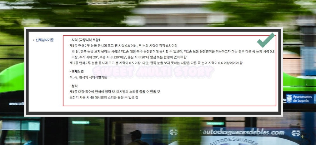 2. 한쪽 눈을 보지 못하는 경우에는 1종 대형 및 특수면허 시험에 응시할 수 없어요. 청력도 55 데시벨의 소리를 들을 수 있어야 하고요. 보청기를 사용하는 경우에는 40 데시벨의 소리까지 들을 수 있어야 신체검사 기준을 통과할 수 있어요.