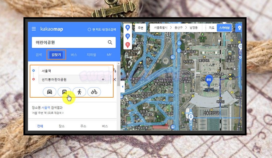 6. 어떻게 가는지 길을 안내 받고 싶다면 메뉴에 있는 길찾기를 클릭해 보세요. 항공사진으로 본 장소를 자가용, 대중교통, 도보, 자전거로 갈 때 도움 되는 정보를 얻을 수 있어요. 출발하는 장소와 도착하는 장소 이름을 입력한 후 이용하려고 하는 교통수단을 클릭해 보세요.