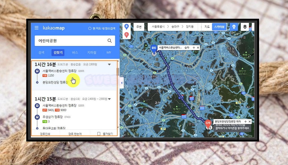 7. 길찾기 서비스에서 각 장소를 입력한 후 대중교통을 클릭했어요. 그럼 이렇게 다양한 루트를 안내 받을 수 있는데요. 걸리는 시간, 대중교통을 이용할 때 지불해야 하는 요금, 이용해야 하는 정류장과 버스 번호를 확인할 수 있어요. 하나의 루트를 선택하면 항공사진지도에 표시도 되기 때문에 어디를 지나 가는지 보기 가능해요.
