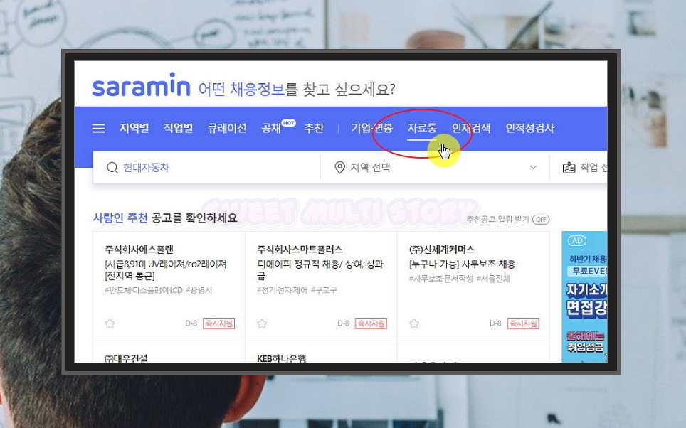 4. 구직할 때 사람인 사이트를 이용하지 않은 사람은 많지 않죠. 이곳에서는 구직할 때 도움되는 정보는 물론이고, 직장 생활을 할 때에 도움이 되는 서비스와 정보를 제공하고 있습니다. 연차 계산을 위해 메뉴에 있는 자료통을 클릭해 보세요.