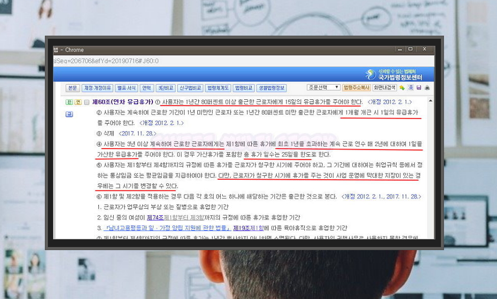 2. 간단하게 연차가 발생하는 기준을 알려드렸는데요. 좀 더 상세하게 확인하고 싶으신 분들은 위 이미지에 나와 있는 국가법령정보센터의 벌률정보를 확인하시면 됩니다.