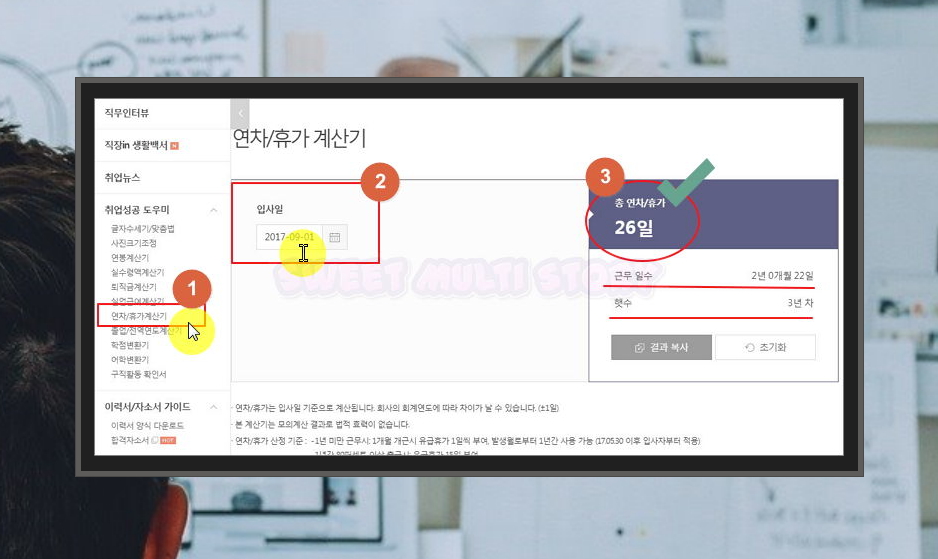 5. 직장 생활에 도움되는 서비스가 많다고 말씀 드렸는데요. 좌측에 있는 취업성공 도우미에 있습니다. 우리가 찾는 연차/휴가 계산기는 물론이고, 연봉, 싱수령액, 퇴직금, 실업급여를 쉽게 계산하게 도와주는 프로그램이 마련되어 있어요. 계산기 프로그램은 연차에 대한 기준을 근거로 하여 알아서 만들어졌습니다. 사용하시려면 입사일을 입력하시면 돼요. 그럼 사용할 수 있는 휴가일수가 나타납니다. 덤으로 근무 일수와 햇수도 확인이 가능해요.