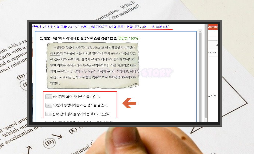 11. 한국사능력검정시험 고급에 대한 자료를 사이트에서 풀어 보았습니다. 결과시간이 나오기 때문에 시간 조절을 하기에 좋습니다. 실전에서는 시간이 부족할 수 있기 때문에 이와 같이 풀이 시간을 관리할 필요가 있어요.