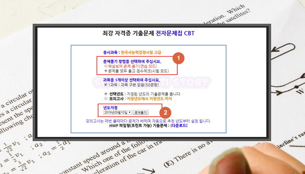 10. 과목을 선택한 후에는 푸는 방법과 연도를 지정합니다. 푸는 방법은 2가지인데요. 해설을 보며 문제를 푸는 것과 모두 풀고 나서 한 번에 채점하는 방식이 있습니다. '연습모드'와 '시험모드'라고 하는데요. 필요에 따라 선택하시면 됩니다.