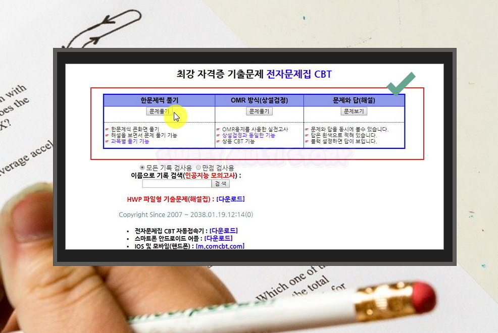 8. '전자문제집 CBT 온라인 모의 테스트' 버튼을 누르면 인쇄하지 않고, comcbt 무료 기출문제 사이트 내에서 기출문제 풀이를 할 수 있습니다. 한 문항씩 풀수도 있고, 실적과 같이 OMR 방식으로 풀어볼 수도 있습니다.