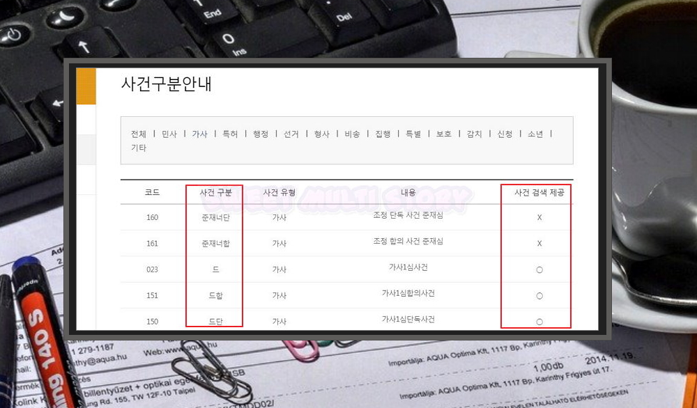 3. 검색을 하기 전에 사건구분안내 페이지에 접속해주세요. 유형과 내용에 따라 구분 표기를 확인할 수 있어요. 일부는 검색 서비스가 제공되고 있지 않아요. 이러한 부분을 꼭 확인해 주세요.