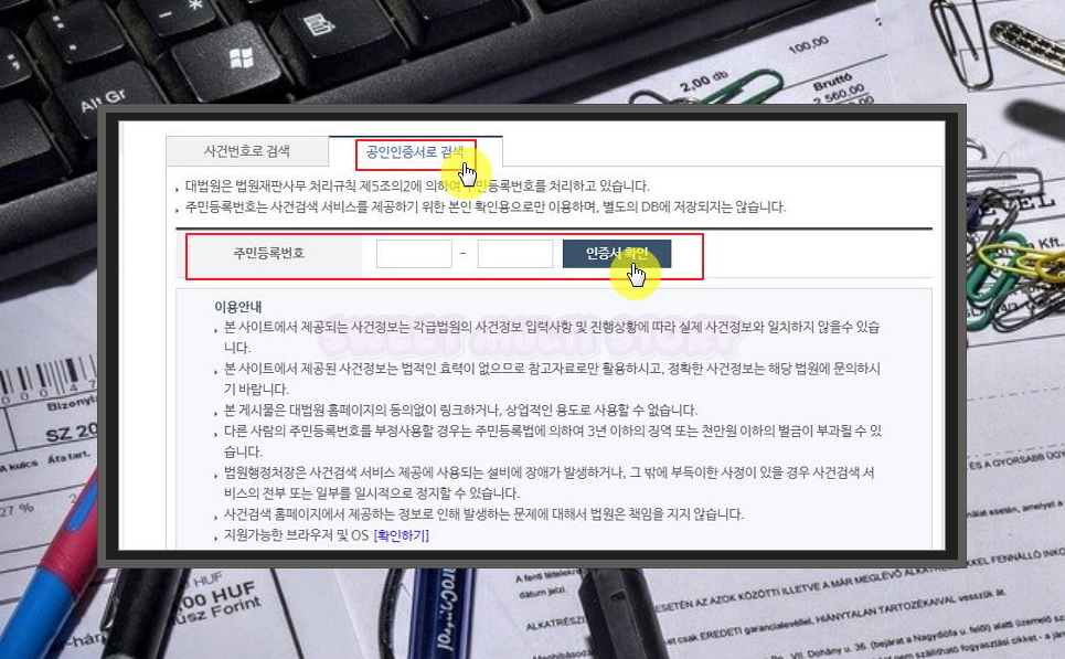 6. 상황이 여의치 않아 도저히 나의 사건번호를 알 수 없을 수 있어요. 이런 경우에는 공인인증서를 이용해 보세요. 주민등록번호를 입력하고, 인증서 확인 버튼을 누르면 되요. 그 다음은 인터넷 뱅킹을 이용할 때와 같이 공인인증서를 선택한 후 암호를 입력하면 되죠.
