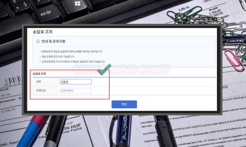 5. 송달료를 예납한 경우 간단한 정보 입력을 통해 나의 사건번호를 알아낼 수 있어요. 신한은행 송달료 조회 링크를 눌러 보세요. 그럼 이렇게 성명과 은행번호를 입력하라고 나오는데요. 이를 모두 입력하면 바로 확인이 가능합니다. 꼭 신한은행이 아니어도 돼요. 다른 은행에서 송달료를 예납한 경우에도 조회를 할 수 있어요.