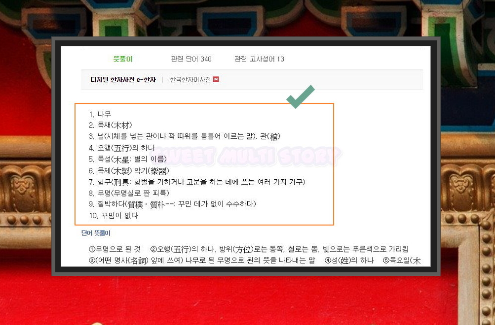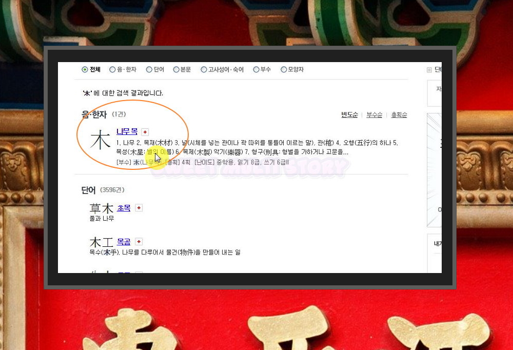 8. 그 다음으로는 뜻풀이를 살펴볼 수 있는데요. '나무 목'자의 뜻만 10가지가 되네요. 이렇게 두꺼운 옥편보다 많은 양의 정보를 살펴 볼 수 있어요.
