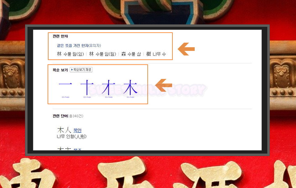 10. '나무 목'에는 같은 뜻을 가진 한자인 유의자가 있는데요. 수플 림, 수플 입, 수풀 삼, 나무 수 이렇게 4가지 문자가 있어요. 획순 보기를 통해 그리는 순서를 익혀보세요. 다음에 그려서 한자찾기를 할 때 도움이 될 거에요.
