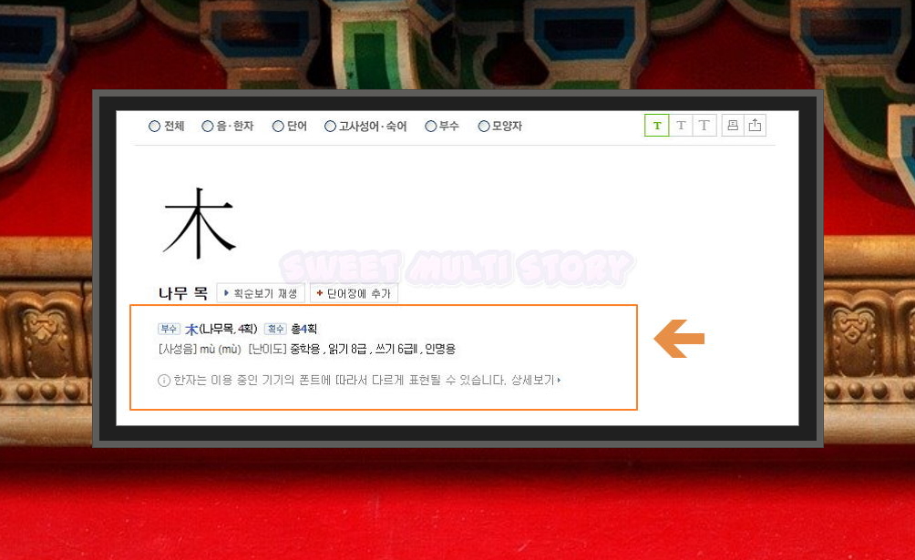 7. 한자찾기 과정의 최종 화면이에요. 가장 먼저 사성음, 난이도, 부수, 총획수를 확인할 수 있어요.