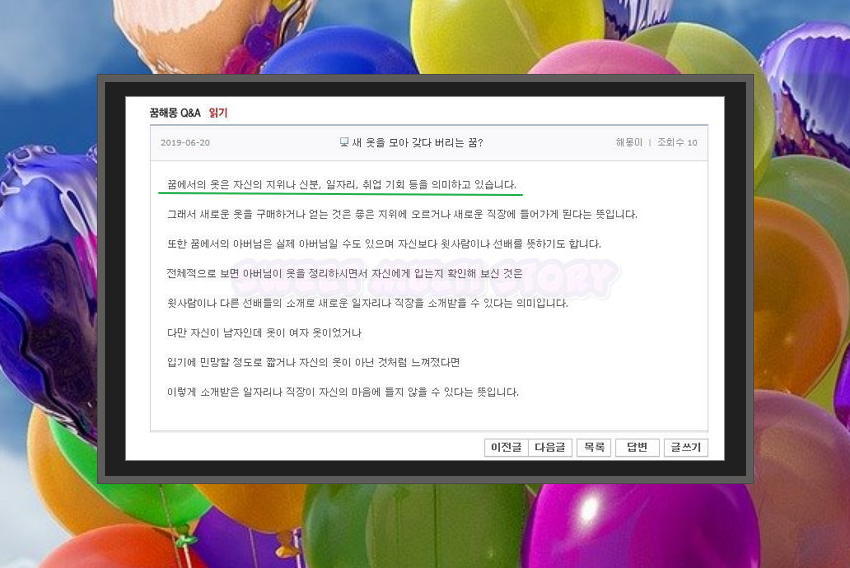 7. 어떤 분이 새 옷을 모아 갖다 버리는 꿈을 꾸었다고 글을 올렸는데요. 상세한 풀이가 답변으로 올라왔네요. 옷은 일자리, 신분, 지위 등을 의미한다고 하네요. 옷을 갖다 버리는 것은 새로운 직장에 들어가거나 좋은 지위로 올라갈 수 있다는 뜻이라고 하네요.
