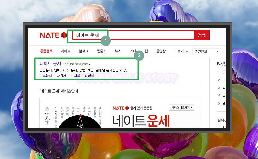 1. 해몽을 할 때에 찾는 인터넷 사이트가 있어요. 바로 네이트 운세인데요. 신년운세, 사주, 운세, 궁합 등 운세 위주의 사이트이지만, 해몽 서비스의 퀄리티가 뛰어나 자주 이용하는 곳이에요. 이곳에서 일부 운세 서비스는 유료이지만, 해몽 서비스는 무료 입니다.