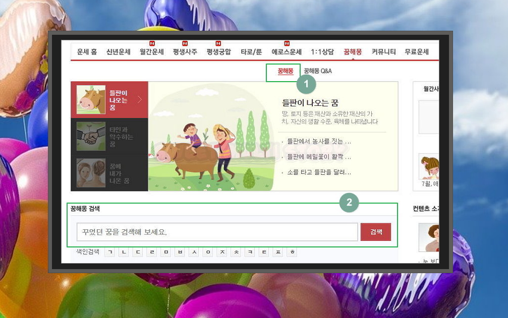 2. 메뉴에서 오른편에 위치한 꼼해몽을 클릭해 주세요. 검색창을 통해 어젯밤 꾸웠던 꿈을 검색해 보세요. 들판에 나오는 경우, 소를 타고 틀판을 달리거나 타인과 악수하는 경우 등 다양한 내용을 찾아볼 수 있습니다. 여기에서 자신이 꾼 꿈과 가장 흡사한 것을 선택하면 풀이 내용을 무료로 살펴볼 수 있어요.