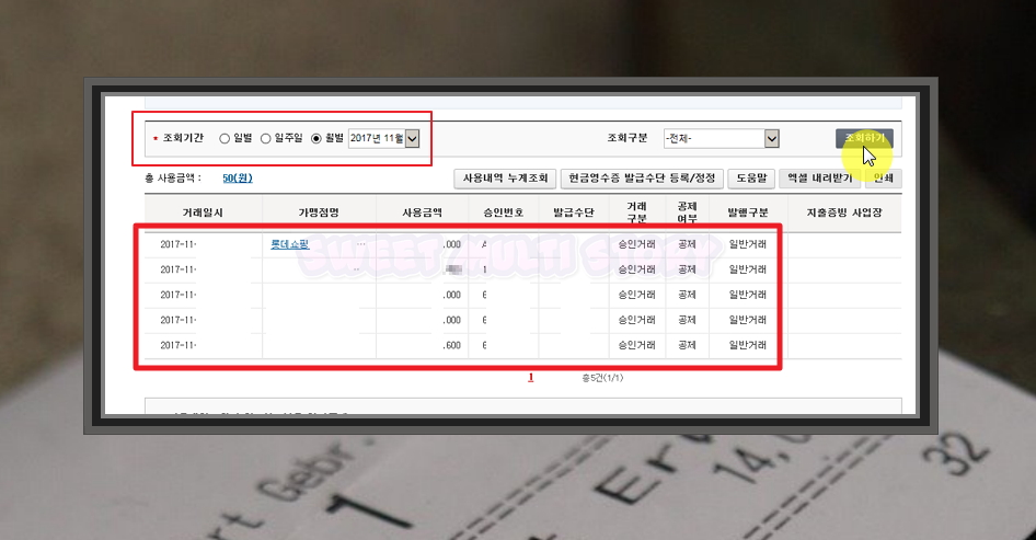 4. 사용내역조회 서비스는 월별, 일주일, 일별 이렇게 3가지 방식으로 조회할 수 있어요. 사용내역 누계조회나 현금영수증 발급수단 등록 및 정정도 가능해요. 승인번호도 명확하게 살펴볼 수 있어요. 엑셀로 정리하고 싶은 분들은 [엑셀 내려받기] 버튼을 눌러보세요. 국세청으로부터 엑셀 파일로 된 관련 자료를 받을 수 있어요.