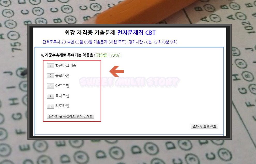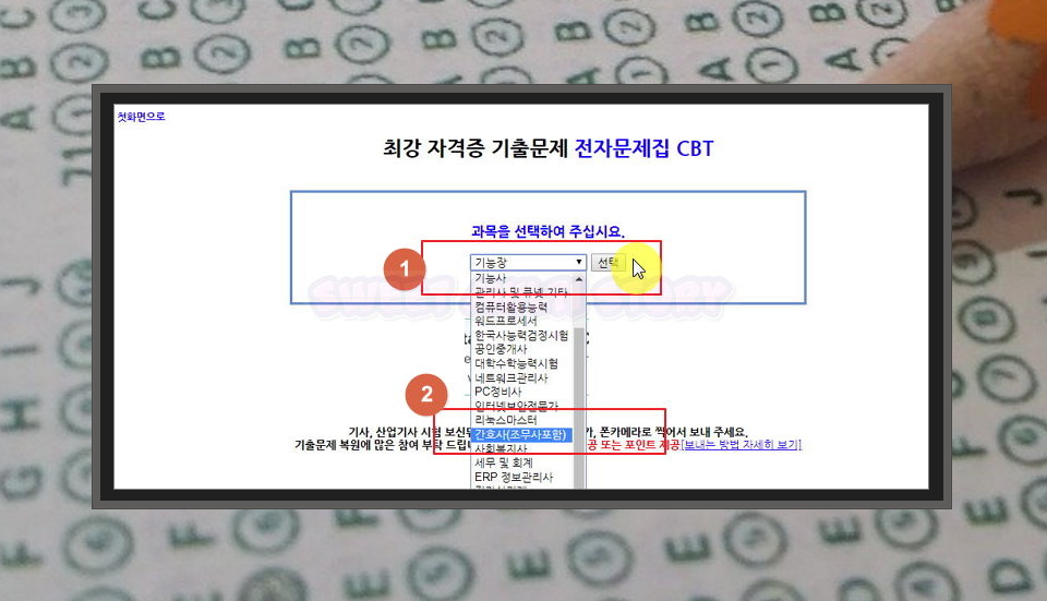 5. 이전 단계에서 온라인 모의 테스트 버튼을 누르면 간호조무사 시험 문제를 인터넷 상에서 풀어볼 수 있어요. 먼저 과목을 선택해 주세요.