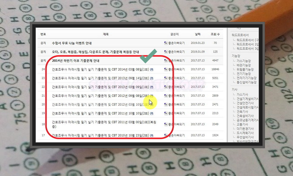 3. 연도와 회차에 따라 다양한 간호조무사 자격시험 필기 및 실기 기출문제가 나타나는데요. 풀고자 하는 게시물을 클릭해 주세요.