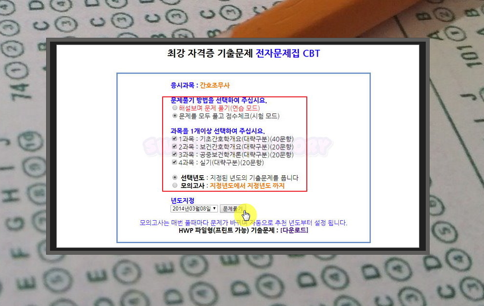 6. 시험은 기초간호학 개요 40문항, 보건간호학 개요 20문항, 공중보건학 개론 20문항, 실기 20문항 이렇게 4가지 과목으로 구성되어 있어요. 년도를 지정한 후 문제풀기 버튼을 누르면 돼요.