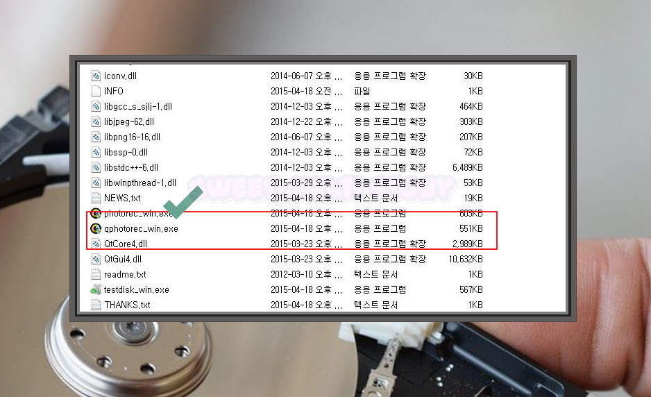 4. 내려 받은 압축 파일을 풀어 보았어요. 여러 가지가 들어 있는데요. 데이터 복구를 하신다면 Qphotorec_win을 실행하면 돼요.