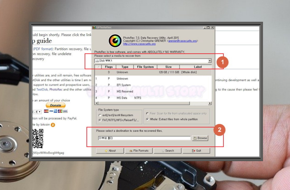 5. phohorec 프로그램이 실행되었어요. 이제 데이터를 복구해 볼게요. 우선 데이터가 지워진 하드디스크를 선택해 주세요. 스마트폰에 있는 데이터를 복구하고 싶은 경우에는 스마트폰을 연결한 후 저장 메모리를 선택하면 될 거에요.