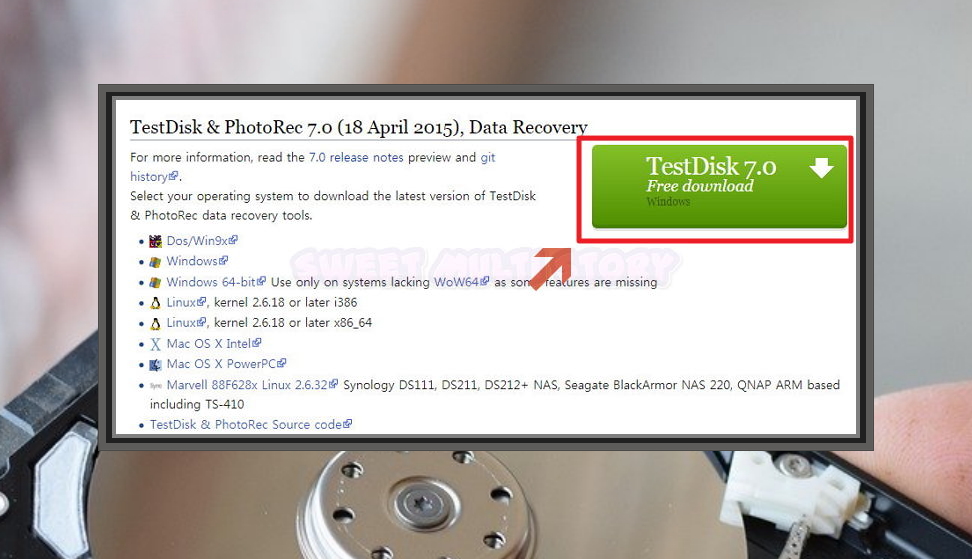 3. 2가지 프로그램이 나타나는데요. Testdisk 7.0과 배타버전인 7.1이 있어요. Free download 버튼을 누르면 파일 복구 프로그램을 내려 받을 수 있는데요. 다운 받은 파일을 보면 압축이 되어 있어요. 압축을 풀면 PhotoRec 프로그램도 함께 있는 것을 확인하실 수 있어요. 윈도우에서는 물론이고, DOS, 리눅스, Mac OS에서도 사용하실 수 있어요.