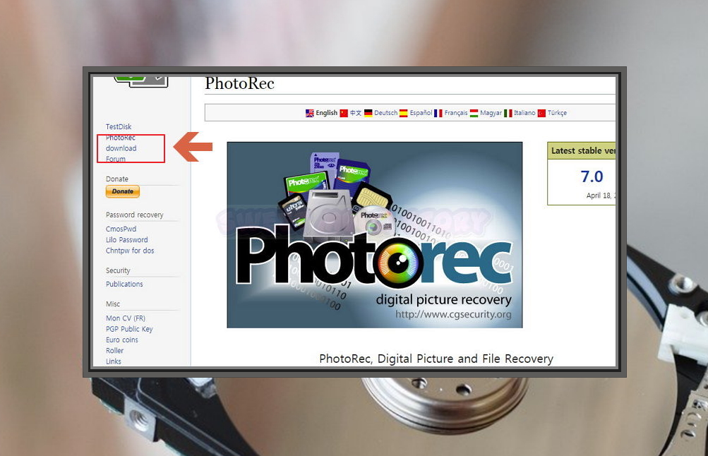 2. photorec 사이트에 접속하면 왼쪽에 download 버튼이 있어요. 데이터 복구 프로그램을 다운 받을 수 있는 페이지인데요. 후원 버튼에서 알 수 있듯이 이곳에서는 자신들이 만든 소프트웨어를 무료로 사용할 수 있게 해주는 대신에 후원을 하고 싶은 사람들로부터 후원을 받고 있어요.