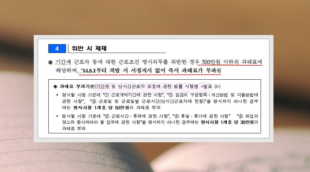 1. 기본적으로 정규직은 물론이고, 기간제 직원 등에 대하여 근로계약서를 작성하지 않은 경우에는 500만원 이하의 벌금이 발생해요. 2014년 8월 1일 이전에는 계약서 미작성이 적발이 되었을 때 시정지시를 받는 경우도 있었지만, 이제는 즉시 과태료가 부과가 돼요. 서류에 빠진 항목에 따라 벌금이 달라지기도 하는데요. 자세히 알려드릴게요.