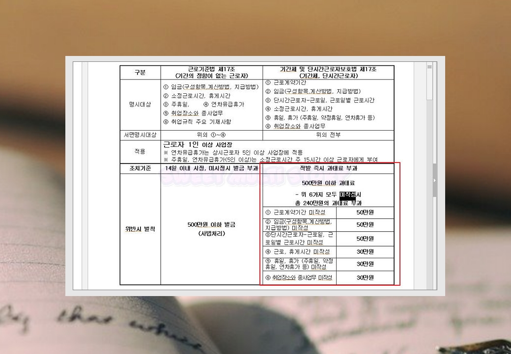 2. 일단 직원이 1인 이상인 사업장이라면 어디서나 근로계약서를 꼭 작성해야 하고요. 기간의 정함이 없는 직원과 기간제, 단시간근로자에 따라 계약서 명시대상과 미작성 벌금에 차이가 있어요. 표를 통해 정확하게 확인하실 수 있는데요. 기간제 및 단시간근로자의 경우에는 기간, 임금, 시간, 휴일 및 휴가 미작성 등에 대한 과태료가 정해져 있으니 빠진 것이 없는지 필히 확인해 보세요.