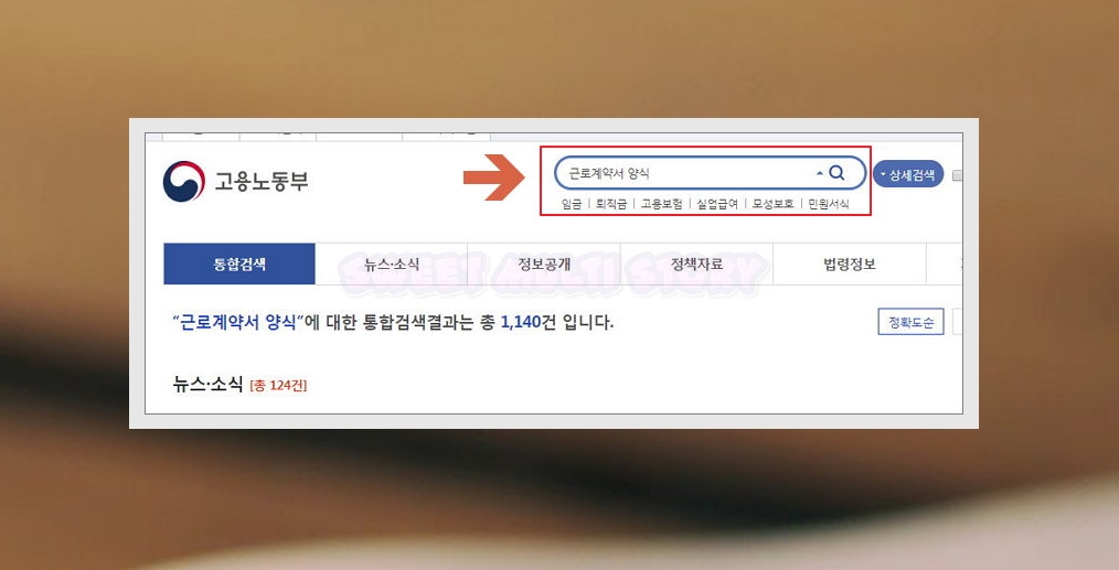 4. 고용노동부 공식 사이트에 접속했으면 오른쪽 상단에 있는 검색창에 [근로계약서 양식]을 입력한 후 [상세검색] 버튼을 눌러주세요.