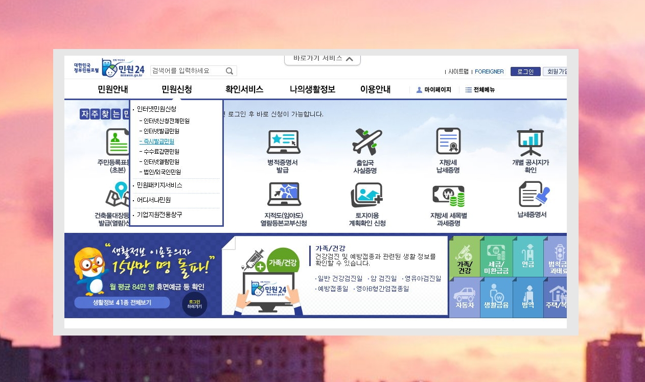 2. 이곳에서는 병적증명서, 주민등록표등본 등의 각종 증명서를 발급 받을 수 있습니다. 자동차등록증을 조회하기 위해서 메뉴에 있는 민원신청을 클릭한 후 "즉시발급민원"으로 접속해 주세요.