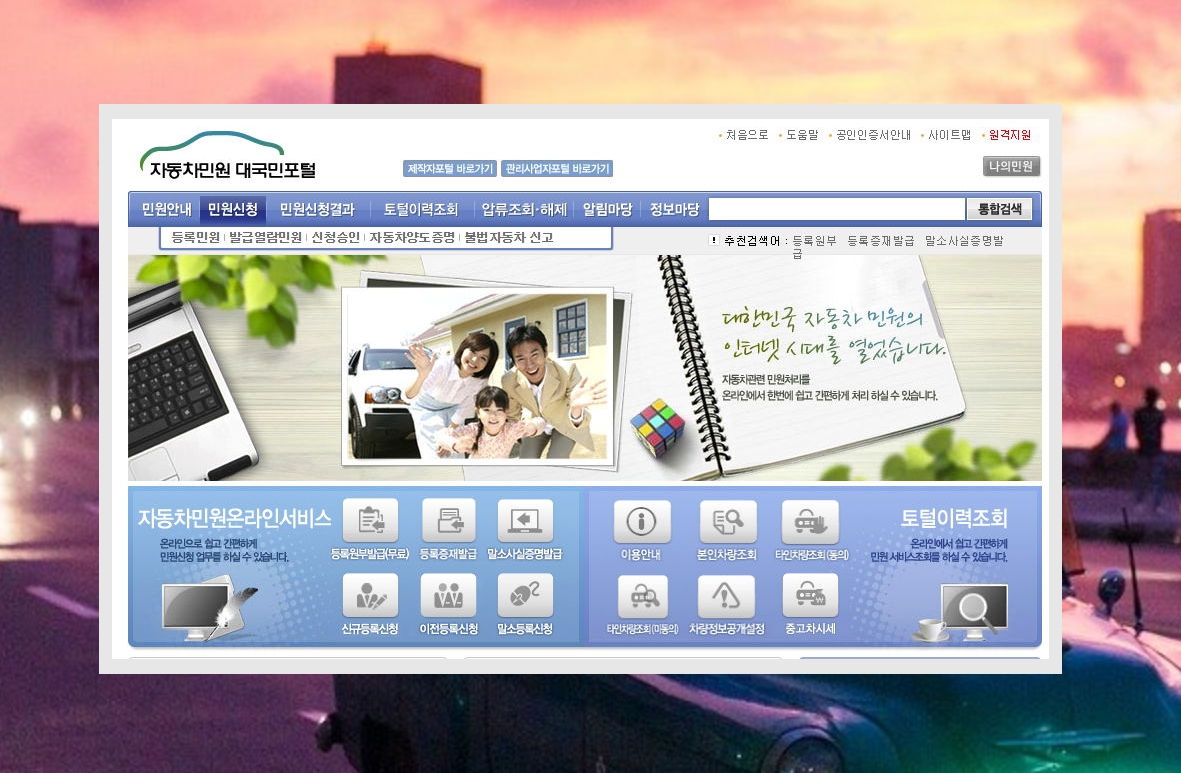6. 대국민포털을 이용해도 자동차등록증 조회를 하실 수 있습니다. 이곳에서는 등록증 재발급도 가능한데요. 홈페이지 메인화면 중앙에 있는 민원 온라인 서비스에 있는 아이콘을 클릭하면 됩니다.