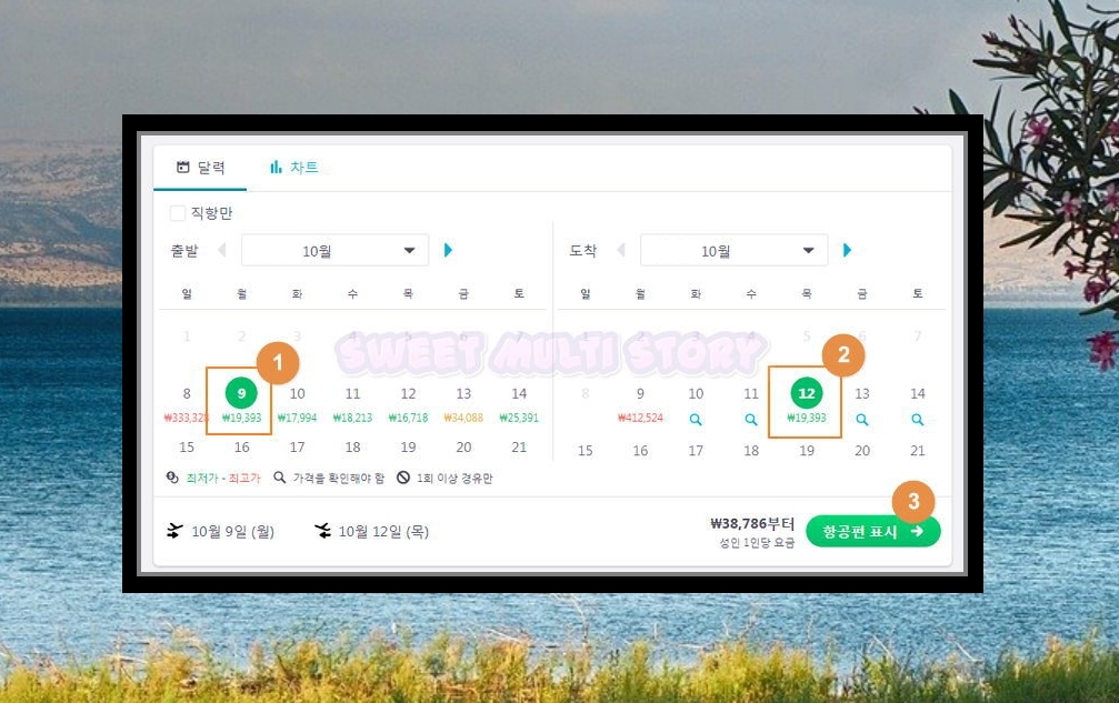날짜를 지정한 뒤에 제주도 항공권을 검색하면 날짜별로 티켓 가격 비교를 할 수 있는데요. 10월 9일에 제주도를 가서 12일에 돌아오는 것이 가장 저렴하네요. 왕복 티켓이 38,786원으로 굉장히 싸게 예매할 수 있습니다. 사는 법에서 팁을 드리자면, 녹색 글씨를 위주로 봐주세요. 녹색은 최저가를 뜻한답니다.
