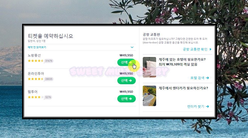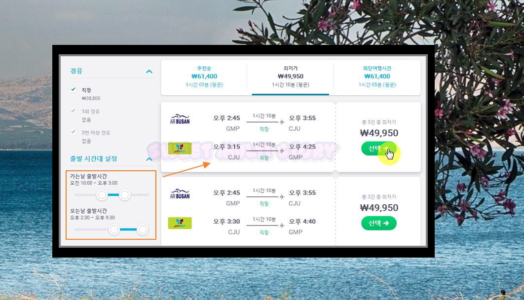 시간대를 조절하니 최저가 제주도 항공권의 가격이 조금 올랐습니다. 시간이 마음에 드신다면 선택 버튼을 통해 항공권 예약을 하실 수 있어요.