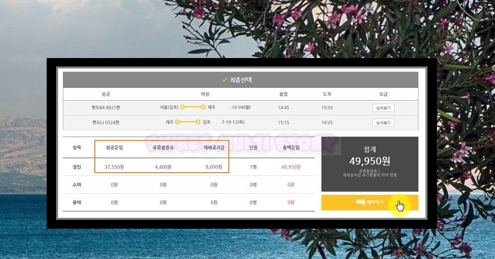 한 곳을 선택해보았습니다. 항공운임, 유류항증료, 제세공과금 등과 같은 제주도 항공권의 상세한 정보를 확인할 수 있는데요. 비행기 티켓 가격까지 모두 확인하셨다면 예약하기 버튼을 눌러 예매를 하시면 됩니다.