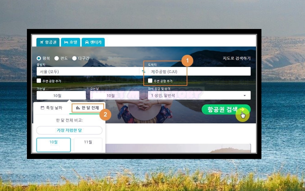 도착지, 가는날, 오는날, 인원수를 입력해야 하는데요. 도착지는 제주도를 선택해주시고, 가는날과 오는날은 '한 달 전체'를 통해 여행하고자 하는 달을 선택해주시면 됩니다. 그럼 그달에서 가장 저렴한 비행기 표를 찾아볼 수 있어요.