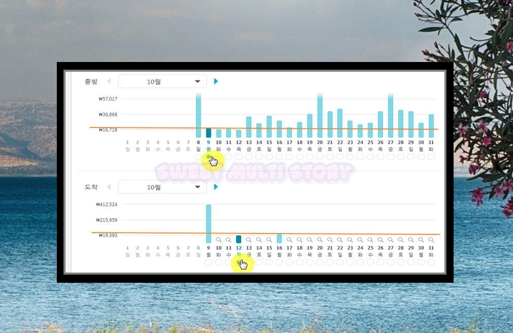 그래프로 보면 한눈에 보기 쉽겠죠? 차트를 이용하여 제주도 항공권 싸게 사는 법을 알려드리겠습니다. 출발이랑 도착 부분에 있는 그래프에서 가장 작은 그래프를 기준으로 가상의 선을 그어보세요. 이 선에 닿거나 아래에 있는 날짜를 선택하시면 비행기표를 싸게 살 수 있습니다.