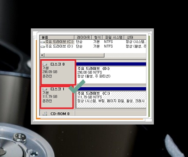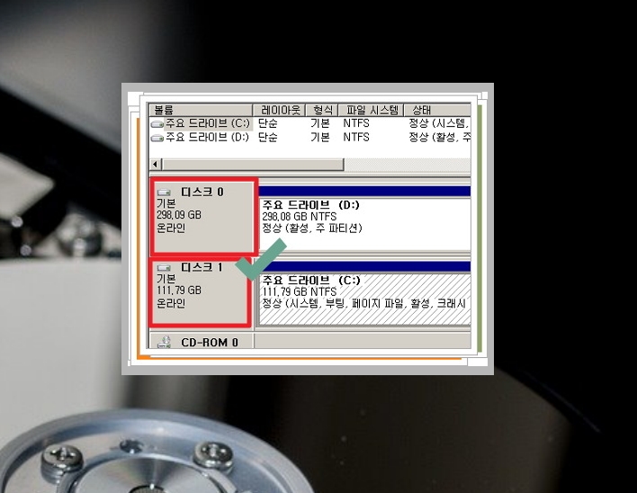 ▲ 디스크 관리에 들어가보시면 위와 같이 컴퓨터에 연결된 디스크(하드)들의 내역이 나타나는데요.