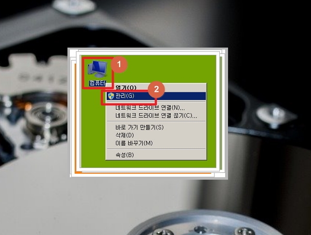 ▲ 바탕화면에 있는 컴퓨터에 마우스 오른쪽 버튼을 눌러보세요.