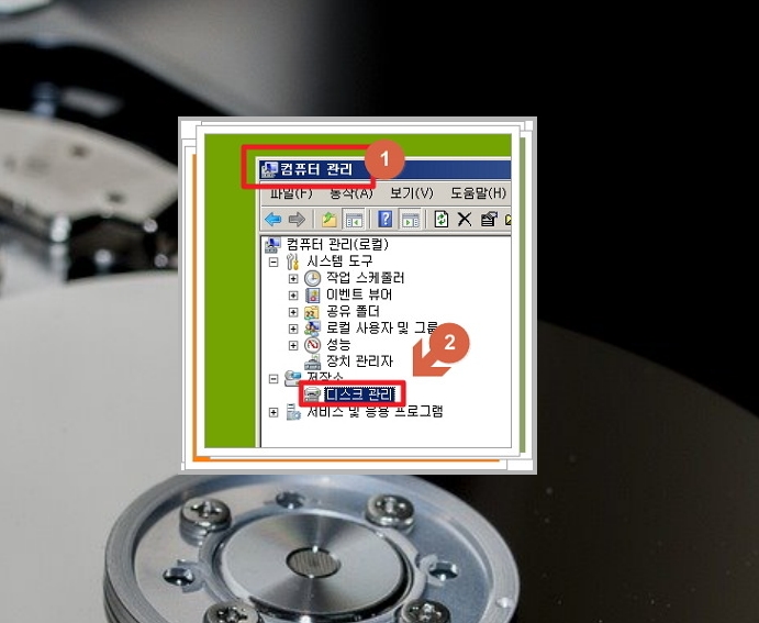 ▲ 컴퓨터 관리 창이 떳는데요. 아래 저장소 부분에 보시면 디스크 관리가 있습니다.