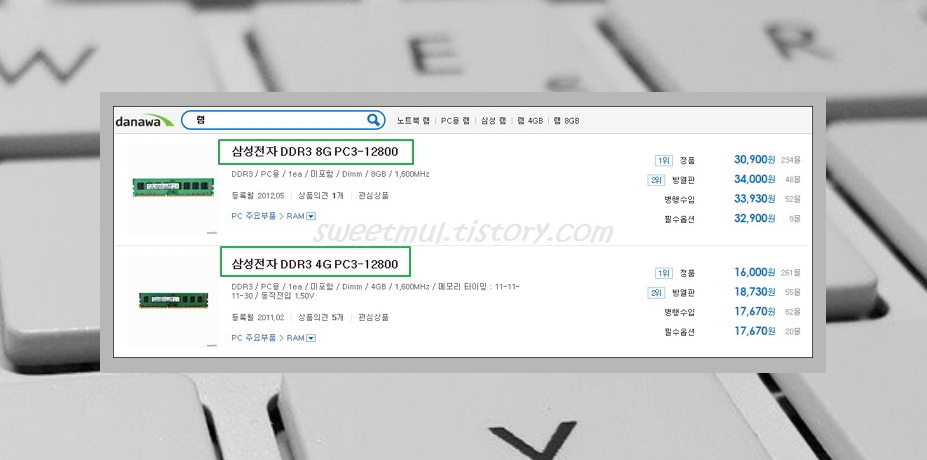 램은 가격대가 어느정도 정해져있기 때문에 구매하기는 쉽습니다. 다나와(컴퓨터부품 가격비교사이트)를 이용하는 것이 좋은데요. 전 최근에 여기서 가장 저렴한 곳을 선택해서 샀답니다.