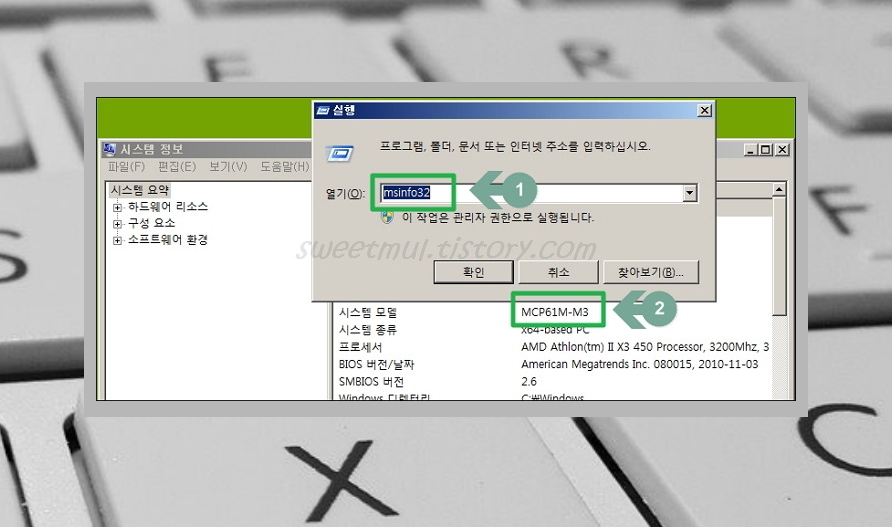 실행창을 켜서 msinfo32라고 입력하고 확인을 누르시면, 쉽게 자신의 메인보드를 확인할 수 있습니다.