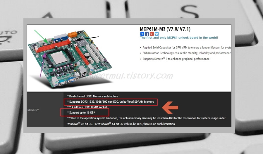 제조사 사이트 들어가보시면 위와 같이 램(Memory)를 뭘 사용할 수 있는지, 얼마큼 사용할 수 있는지 알 수 있답니다.