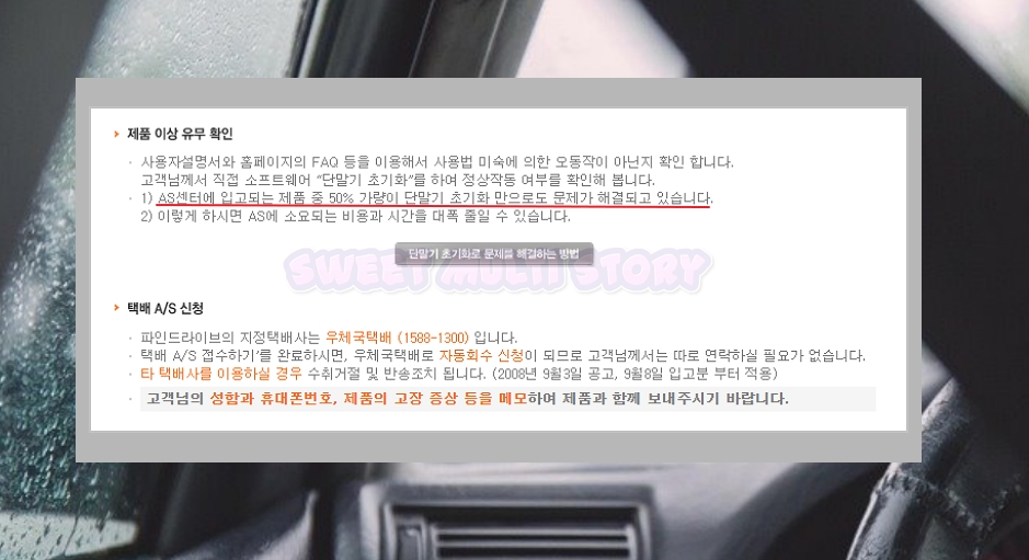 파인드라이브의 AS센터에 서비스를 의뢰하는 제품들 중에서 50% 정도는 단말기를 초기화를 통해 문제가 해결되는 경우가 많다고 합니다. 보통 택배를 보내고 다시 받는 데까지 5일 정도 걸리는데요. 초기화 테스트를 통해 택배비나 서비스비용을 아껴보세요.